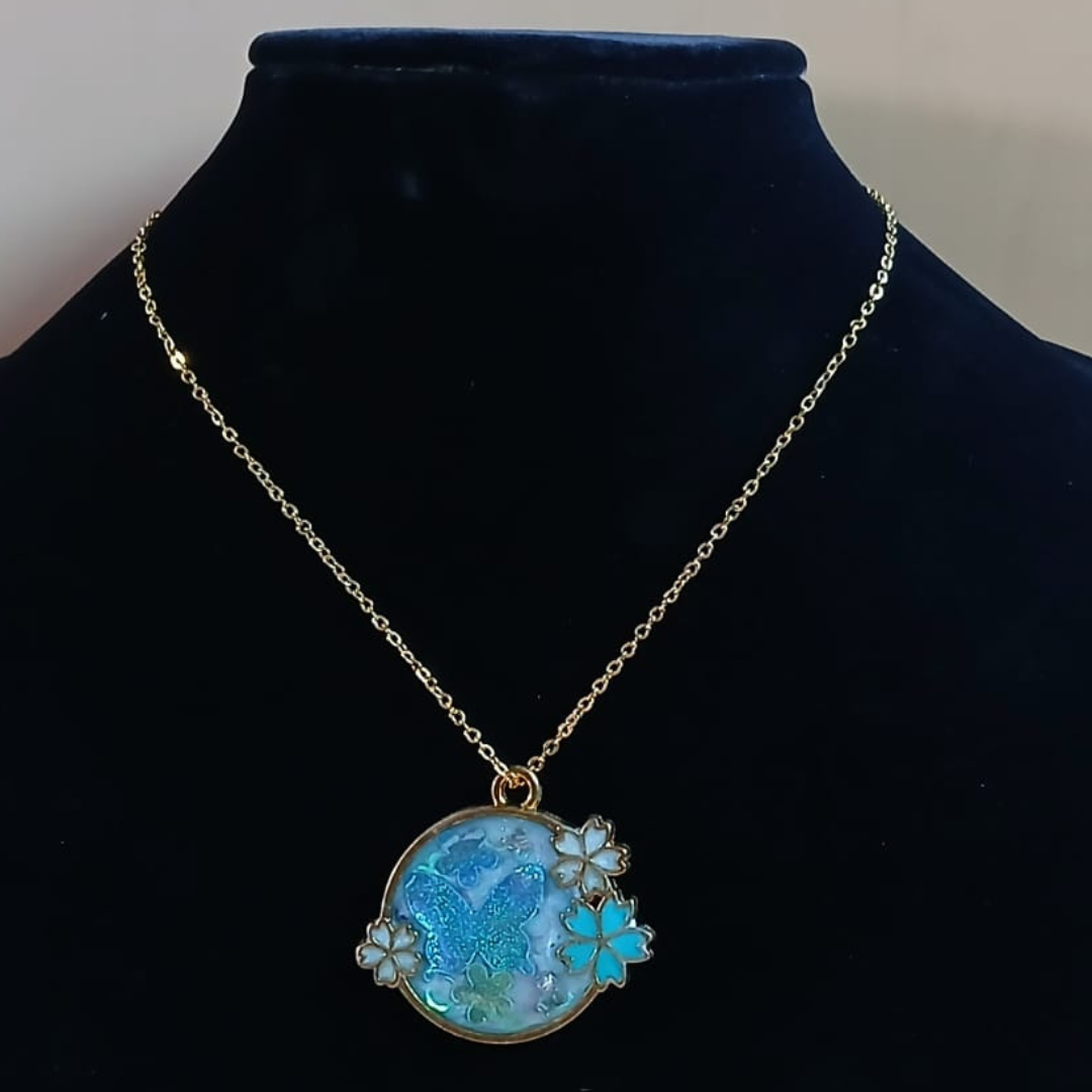The pendant is set in a golden frame, adding sophistication that perfectly contrasts with the cool tones of the butterfly and flowers. It hangs on a refined gold-tone chain, lightweight yet durable, making it comfortable for daily wear or special occasions.